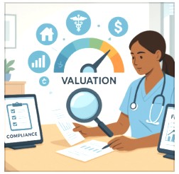 Professional healthcare advisor meeting with a Home Healthcare Agency owner, reviewing valuation strategies with financial documents and patient care background visuals.